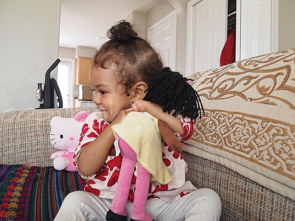 this month grandmother – daddy’s mum – sent in a parcel for you. in this parcel she put two jumpers she knitted and doll that looks like mummy. Dolly likes when you kiss her cheeks, button nose and cuddle her.